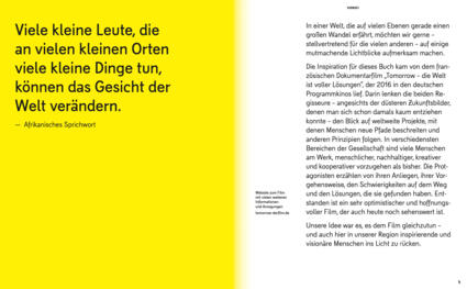 The inspiration for this book came from the French documentary "Tomorrow – The World Is Full of Solutions," which was shown in arthouse cinemas a few years ago. In light of the bleak future scenarios that were already hard to escape in the media at the time, the film drew attention to global projects in which people were embarking on new paths and following different principles. In various areas of society, many people are working to act in a more humane, sustainable, creative, and cooperative way than before. The protagonists talk about their concerns, their approach, the difficulties they encountered along the way, and the solutions they have found. The result is a very optimistic and hopeful film that is still worth watching today.
